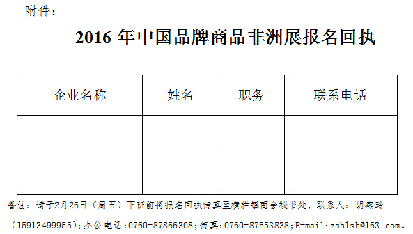 为加快促进我省外贸企业走出去,提高广货在非洲市场的竞争力,中山市商务局将组织企业参加于2016年6月19日-21日在非洲约翰内斯堡加拉格展览中心举办的“2016年中国品牌商品非洲展”。展品范围包括日用百货、轻工和食品、五金工具和建材用品三大类,展位21000/个、报名费:2000/企业。现将相关通知转发给你们,请有意向参展的企业于2月26日前将参展报名表传真或致电镇工商联(商会)秘书处。联系人:胡燕玲(15913499955);办公电话:87866308;传真:87553838;邮箱:zshlsh@163.com。